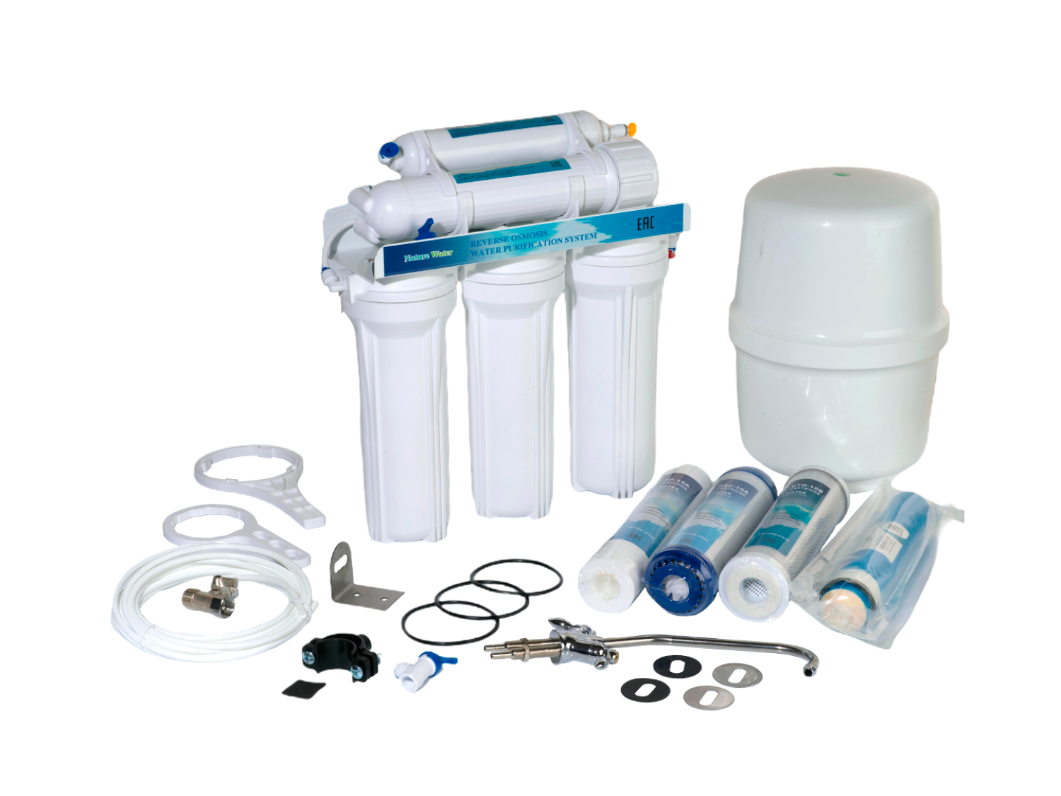 В состав системы входят: пятиступенчатый (четырёхступенчатый) блок фильтрации, накопительный бак 11,6л, водоразборный кран, трубки и фитинги для подключения к водопроводу и канализации.